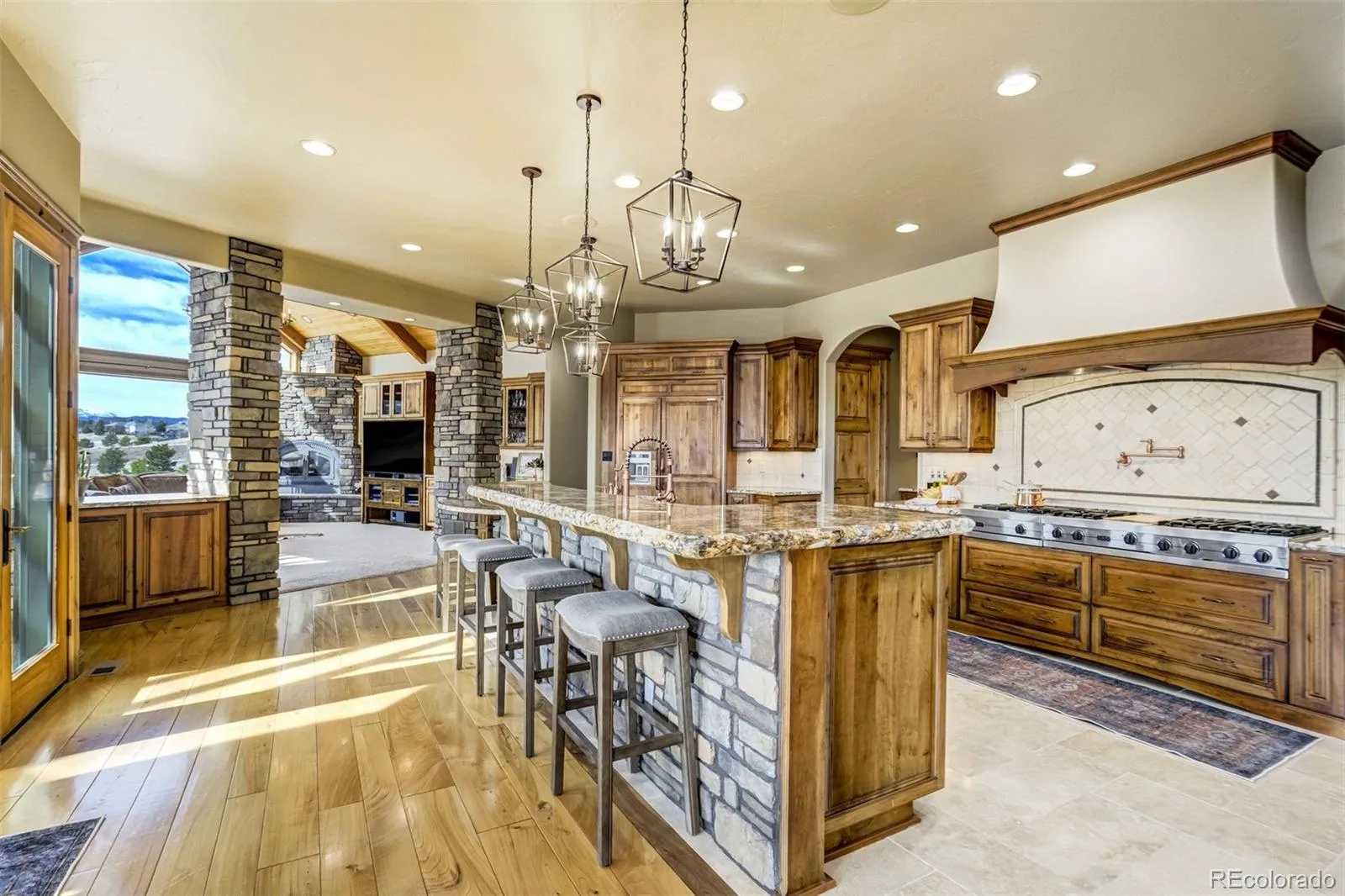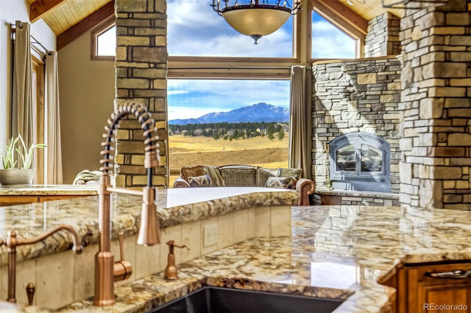 Set high above the fairways of Kings Deer Golf Club, where the land rolls wide and the horizon stretches from the Front Range to the bold rise of Pikes Peak, stands a home built for gathering, reflection, and the quiet luxury of Colorado living. On 2.52 acres in King’s Deer Highlands, this 10,248 sq. ft. custom estate carries the feel of a grand mountain lodge—warm, welcoming, and ready for generations to come. Sunlight pours through walls of windows, drawing the eye to mountain views and open sky while the great room’s soaring ceilings and stone fireplace create a natural place for stories, laughter, and evenings well spent. The main-level primary suite is a retreat of its own, with a three-sided fireplace, sitting room, coffee bar with wet sink, spacious bath, and private patio access—designed for comfort today and ease for years ahead. An elevator, ramp entry, and wide hallways support true aging-in-place living. Two private wings provide space and independence for extended family, guests, or caregivers, each with sitting areas and balconies that capture the sweeping landscape. Downstairs, the walk-out level invites gathering with a media and game lounge, wet bar, wine cellar, and fireplace—perfect for celebrations that last well into the evening. Waterfalls, a reflecting pond, firepit, and grotto-style spa create a setting for quiet mornings or unforgettable nights beneath Colorado’s expansive sky.