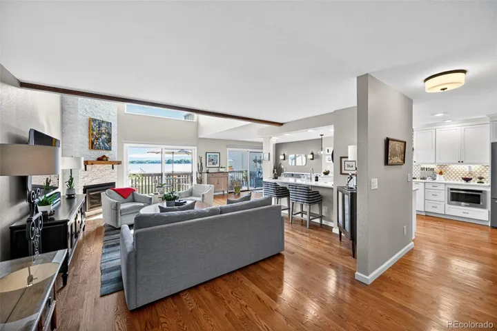 Stunning remodeled townhome bordering Marston Reservoir with uninterrupted views out nearly every window of the serene waters along with the southern Rampart Range mountains! This wonderful two bedroom, 2.5 bath home with a finished walk-out basement was exquisitely remodeled in 2020, with numerous designer touches added since.