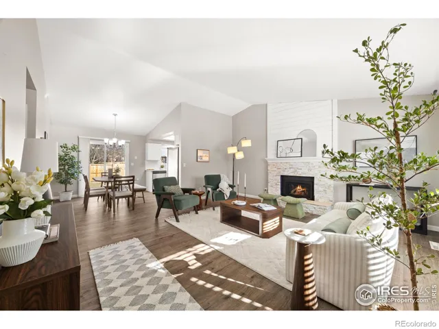 Beautifully updated two bedroom, two bathroom home in Platte River Ranch with bright open living spaces and modern finishes throughout. The main level features wide plank flooring, new windows, a cozy fireplace, and a spacious kitchen with white cabinetry, quartz counters, subway tile backsplash, and stainless appliances. Upstairs offers two generous bedrooms and updated baths.