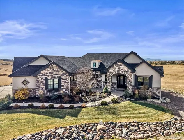 NEW CONSTRUCTION, NO METRO DISTRICT, NEARLY FIVE ACRE HOMESITE, HORSES ALLOWED! Tucked away on nearly five acres of beautifully treed land, this exceptional home offers the perfect blend of privacy, luxury, and space. A long, private driveway leads you to an oversized four-car garage and a stunning residence designed for main level living with an open, thoughtfully designed floor plan.