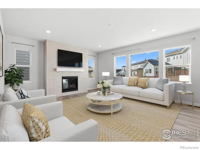 This home features 10’ ceilings, a fireplace with a stained wood mantel, and a spacious kitchen with MasterCraft cabinets, KitchenAid appliances, and a large island. The primary bath includes a dual-head shower and contemporary finishes. Front and backyard landscaping included.
